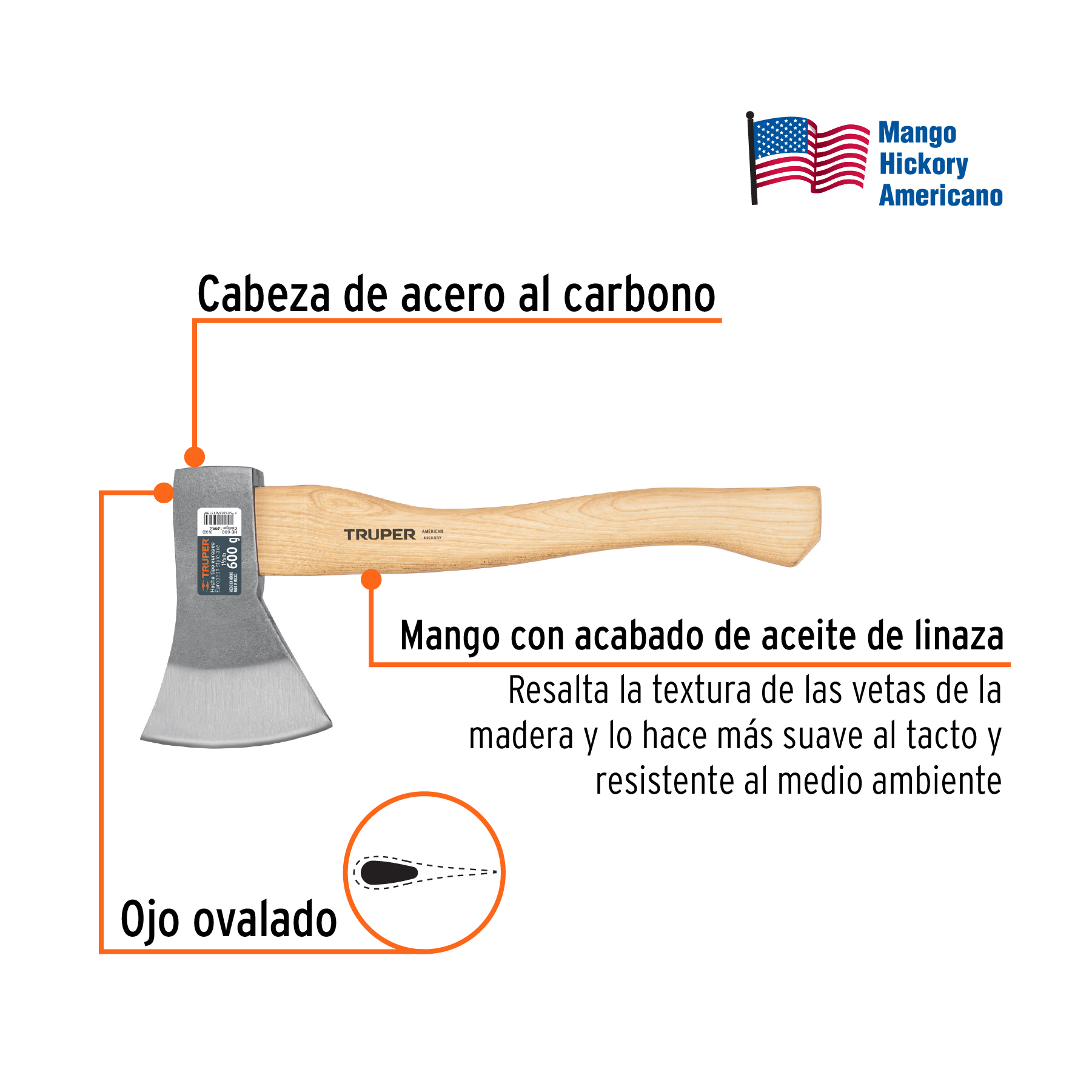 Hacha europea, 600 g, mango hickory 14″, Truper