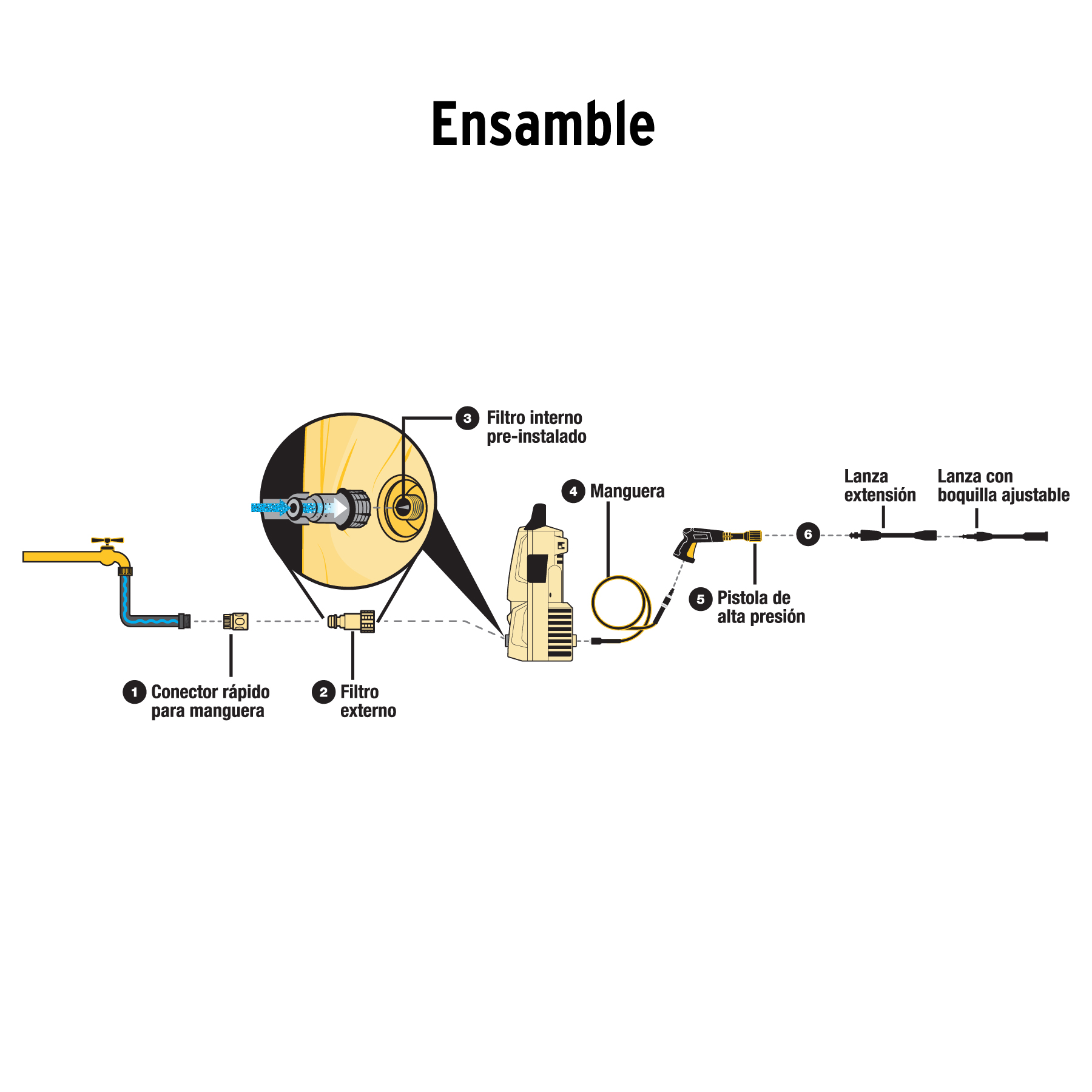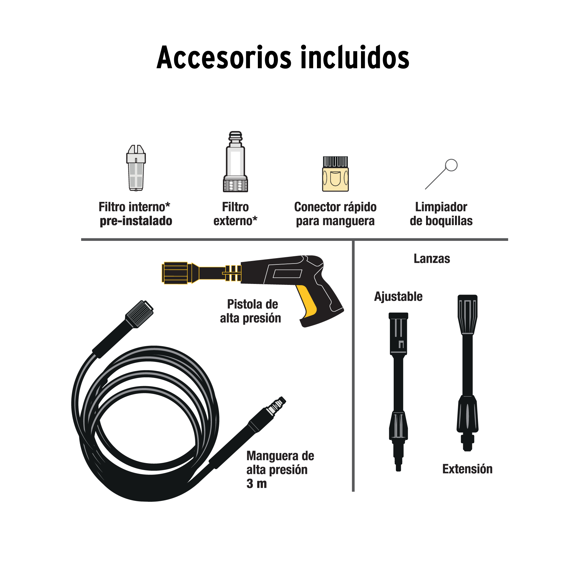 Motor de 1.6 HP, Sistema de paro automático, Flujo máximo de agua 288 L/h, Cable de alimentación de 5 m,  Con porta accesorio para cable de alimentación.