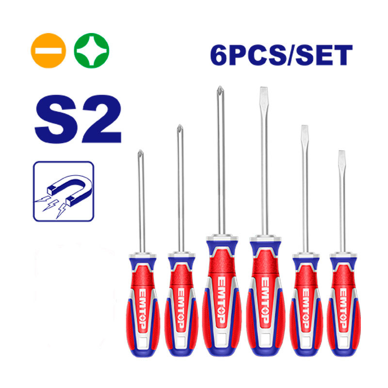 El Juego de 6 Destornilladores EMTOP incluye 3 destornilladores Phillips y 3 planos, todos con punta magnรฉtica para un mejor agarre del tornillo y mayor precisiรณn al trabajar. Estรกn fabricados con acero S2 de alta resistencia y cuentan con varilla redonda, lo que garantiza durabilidad, rendimiento y comodidad en cada tarea.