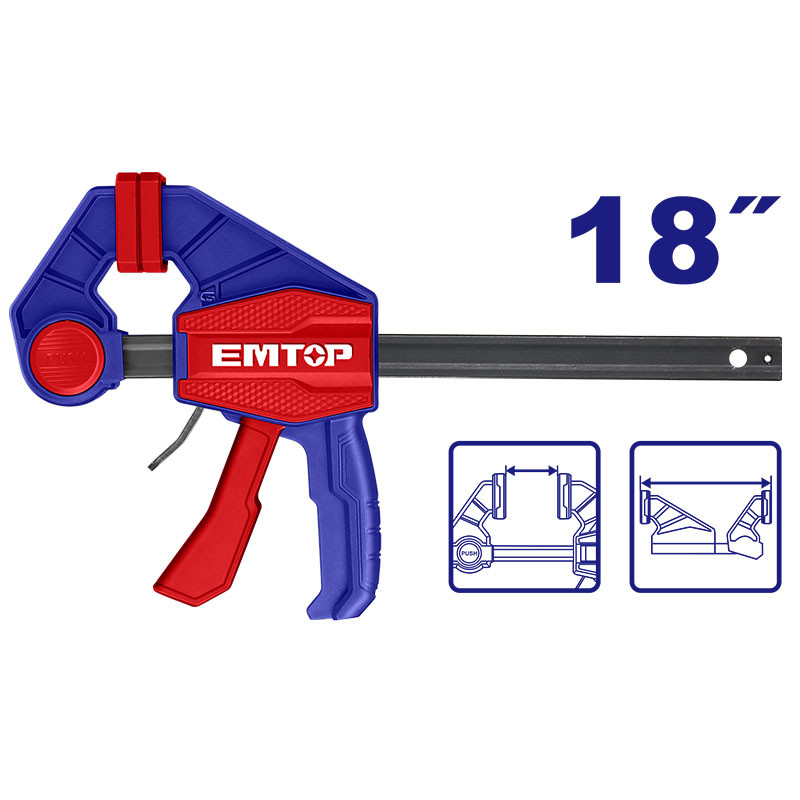 Tamaรฑo de la abrazadera 63 x 450 mm. fuerza maxima de sujecion 60 KG. espesor y ancho de la regla de hierro 5 x 18 mm.